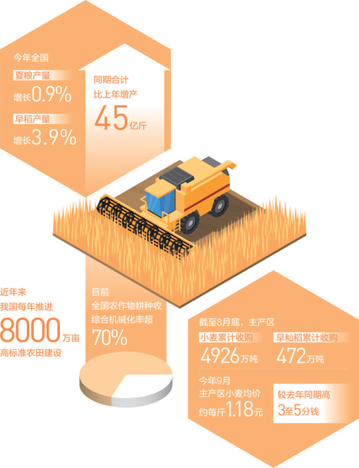 又到一年金秋季。国家统计局日前公布,全国夏粮产量增长0.9%,早稻增长3.9%,同期合计比上年增产45亿斤,目前已经丰收到手。